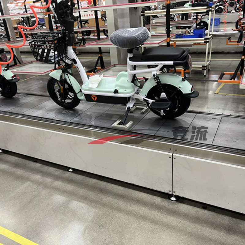 Lightweight conveying system: It adopts wear-resistant belt conveying line, has a load bearing of up to 200kg /station, an adjustable line speed of 0- 1.8 m/min, and is equipped with adjustable positioning clamps to adapt to smooth transfer of electric bicycles with different wheelbases and frame structures. The body is made of aluminum alloy frame, which is light and easy to maintain.